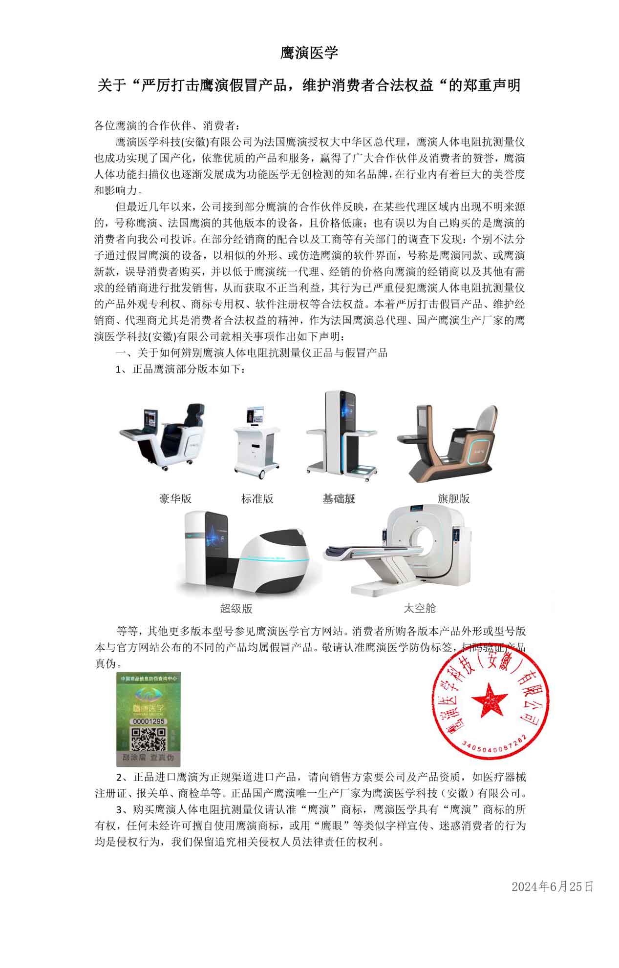 鷹演醫學是一家專注于功能醫學領域的高科技企業,自2005年成立以來,近二十年的潛心研發,一直指引著功能醫學領域的發展潮流。其中,“鷹演”全身健康掃描系統作為公司的核心產品,3分鐘即可檢測人體826項指標,憑借其先進的技術和高性能,在市場上享有很高的聲譽。然而,近年來,隨著鷹演醫學業務的不斷發展和品牌價值的提升,一些不法商販開始利用消費者的信任,大量制造和銷售假冒的“鷹演”全身健康掃描系統。